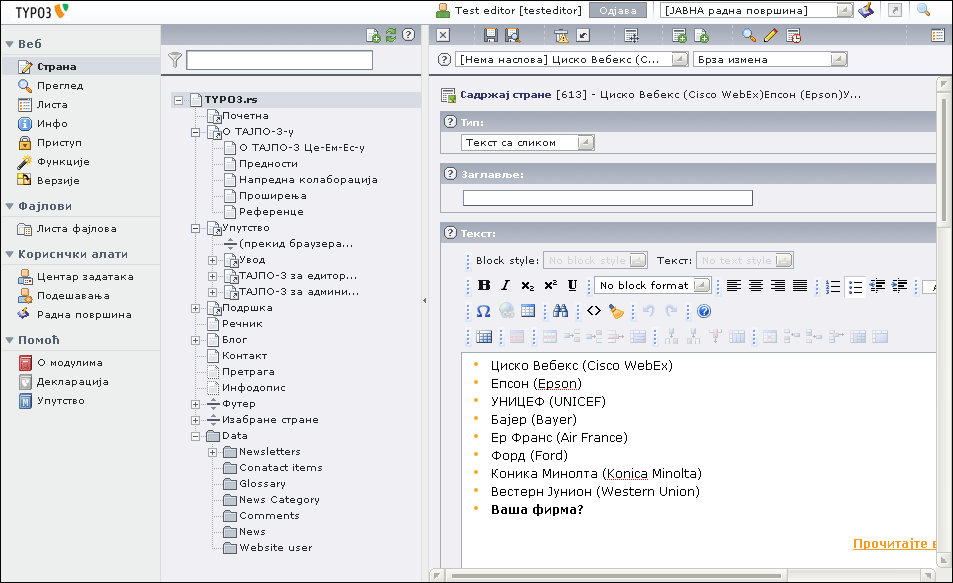 U zavisnosti od modula, navigacija se vrši kroz navigacione oblasti. U glavnom, Veb modulu, može se videti stablo strana (slika 7), gde su prikazane sve strane koje su dostupne određenom editoru.