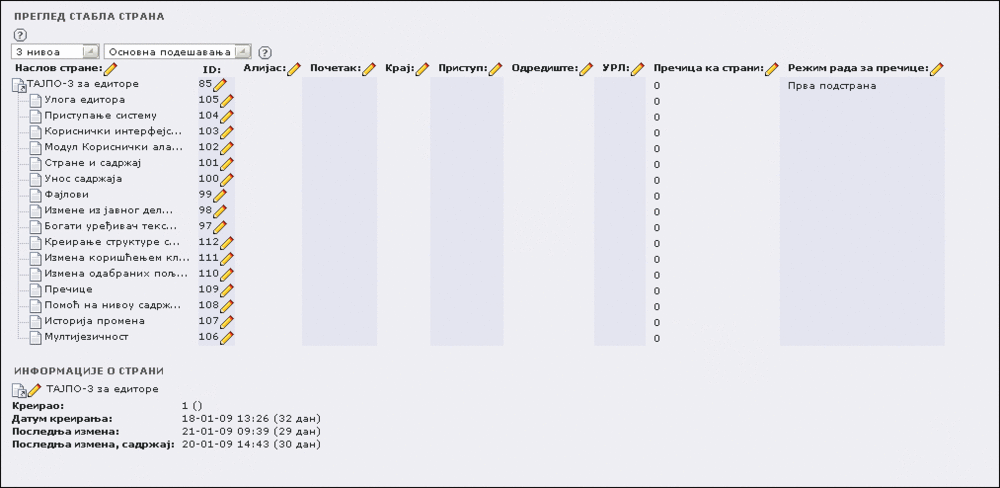 Ovaj prikaz sadrži 'Osnovna podešavanja' (slika 15) (kao što su vremenski kontrolisano objavljivanje strana ili privilegije pristupa korisnika javnog dela sajta), 'Keš i starost' (slika 16), kao i 'Pregled rekorda' (slika 17). Ukoliko se ovaj prikaz koristi za stablo strana, onda se i neke opcije vezane za cele grupe strana mogu menjati jednim klikom miša na ikonu 'olovka'.
