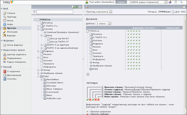 Ukoliko je ovaj modul dostupan editoru (u zavisnosti od njegovih privilegija) on može menjati dozvole prikaza pojedinačnih strana korišćenjem prikaza 'Pregled korisnika' (slika 21). Samo ukoliko je editor i 'vlasnik' određene strane, on može izmeniti dozvole, ukloniti ih ili preneti vlasništvo na drugog editora.